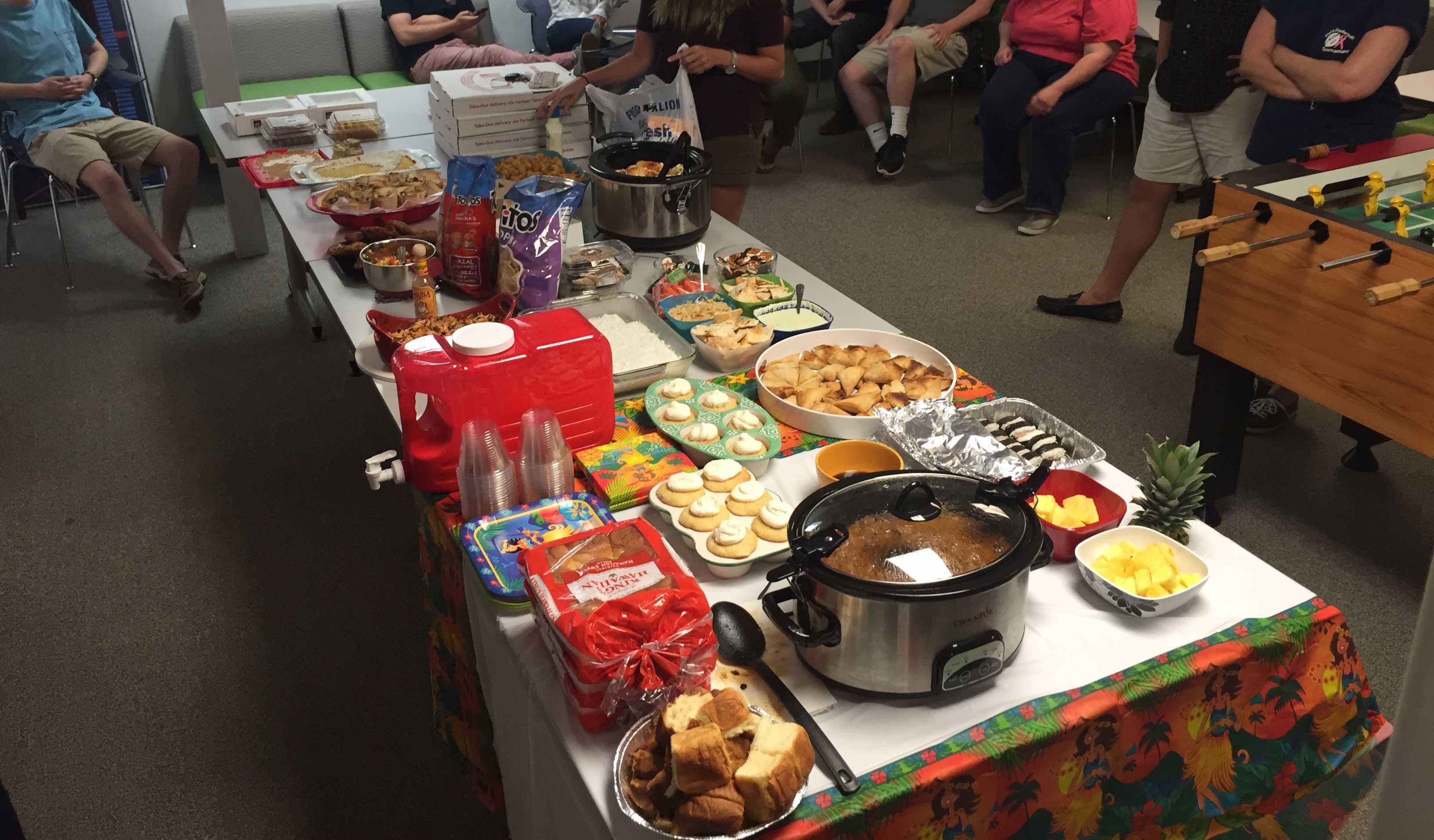 Throughout the morning we all snuck a peek at the dishes in various crockpots lined up across the counter. The Mexican elotes were simmering and the refrigerator was almost too full to hold another thing. As noon inched closer and closer, the smells in the office were enough to have us all counting down the minutes to chow time.