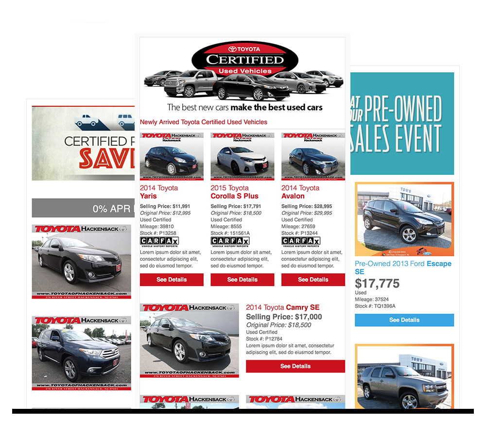 Instead of sending a large volume of emails to customers, our Targeted Inventory Streams act as a larger automated and intelligent communication strategy. By using predictive sales modeling, our streams can zero in on interested customers and dynamically generate personalized, conversion-focused campaigns (pictured above). These consumer-directed marketing communications market to your customers based on their personal interests and buying intent, reaching more of your audience and drive more sales traffic to your website. It's all thanks to our live inventory integration, enabling our system to automatically pull in product info such as lot photos and pricing and driving customers to Supporting SRP and VDP Landing Pages.