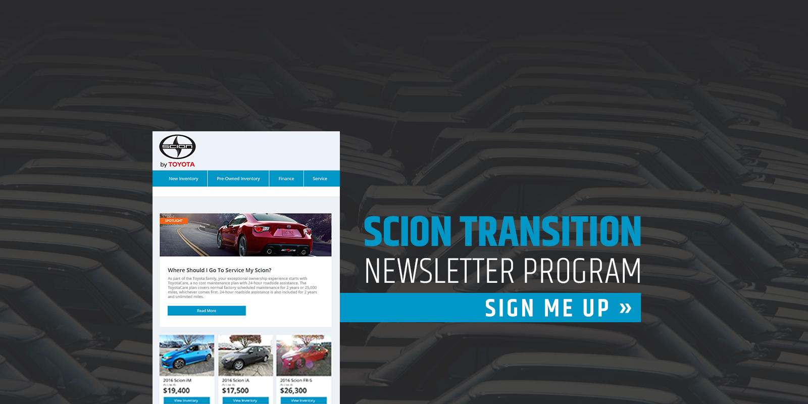 The Scion newsletter was designed to help you sell down your existing Scion inventory, answer your Scion customers’ questions about what the brand transition means to them and smoothly transition them to the Toyota side of your operation for the ongoing care of their vehicle and future automotive needs.